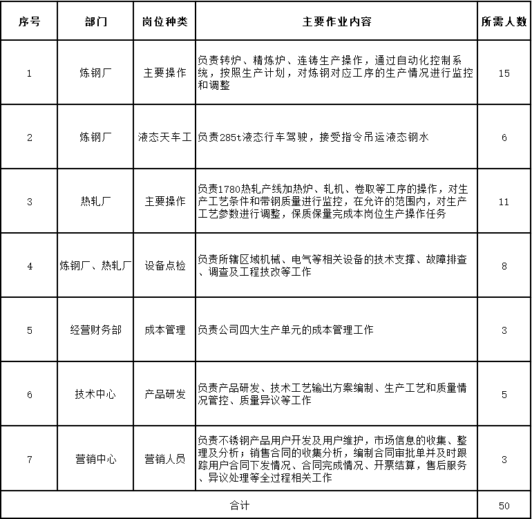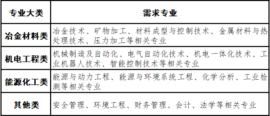 招聘主要有冶金工藝、軋鋼工藝、產品研發、機械、電氣設備管理等崗位,具體專業需求如下: